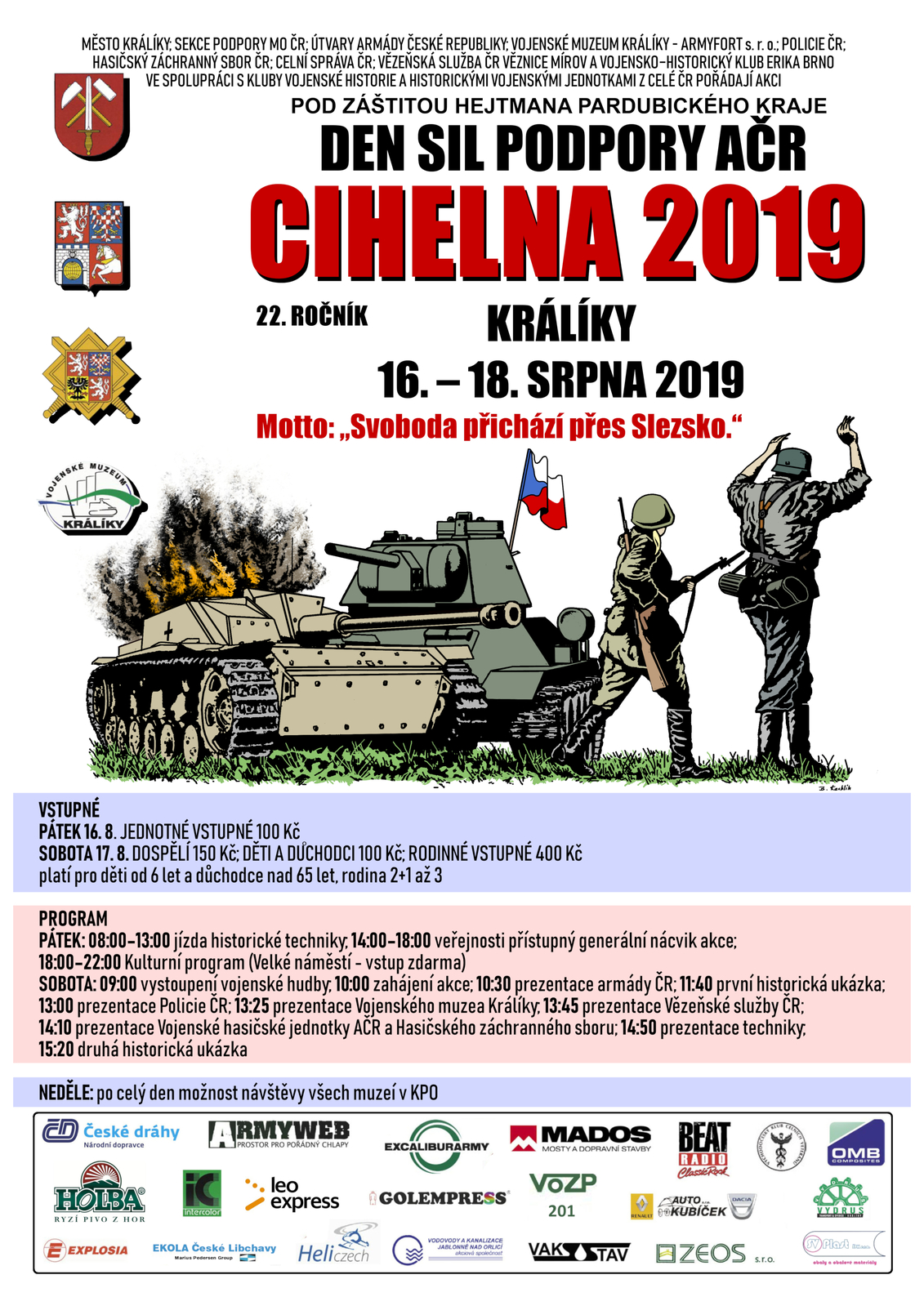Pod záštitou hejtmana Pardubického kraje, DEN SIL PODPORY AČR, se uskuteční 16. - 18.srpna 2019, 22.ročník akce CIHELNA. Motto: "Svoboda přichází přes Slezko."