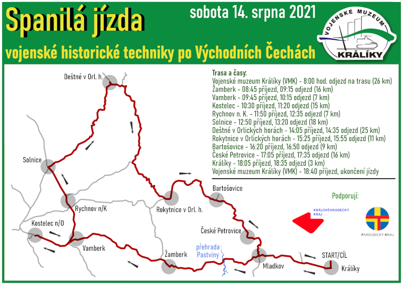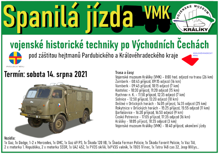 V sobotu 14. srpna pojede Vaší obcí kolona historických, převážně "zelených" vozidel, v rámci Spanilé jízdy 2021. Akce se koná pod záštitou hejtmanů Pardubického a Královéhradeckého kraje - JUDr. Martina Netolického, Ph.D. a Mgr. Martina Červíčka, brig. gen. v. v. a organizuje ji Vojenské muzeum Králíky - společnost ARMY FORT s. r. o. Vozidel budou cca tři desítky - od prvorepublikových, přes válečné až po techniku z výzbroje a výbavy ČSLA - motocykly, osobní, štábní i nákladní vozy. Osádky vozidel budou převážně v historické ústroji s dobovou výbavou a některé i s historickou výzbrojí. Zbraně budou deaktivované (nefunkční), nebo bez munice. Střelba na akci předváděna nebude. Akce připomíná 76. výročí konce 2. světové války, naše předky, hrdinství i jejich um. Některá zařazená vozidla připomenou také 30. výročí vzniku Policie České republiky.
